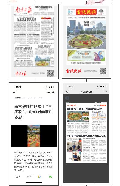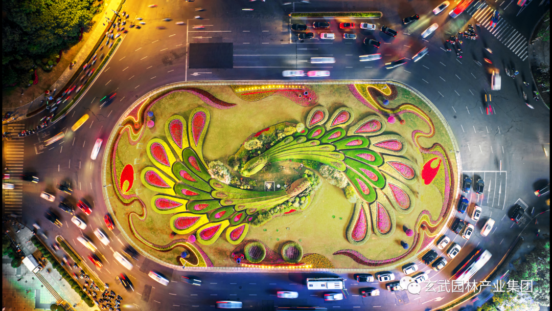 以“喜迎二十大,奮進(jìn)新征程”為設(shè)計(jì)主題;在保留孔雀主體綠雕的情況下,圍繞其四周采用繽紛的造型花柱、飄揚(yáng)的紅旗、科技感的“城市背景”及精致飄逸的植物花帶結(jié)合,演繹百年征程、筑夢未來。花帶造型內(nèi)含“2022”亮化展示,“城市背景”展現(xiàn)在飄揚(yáng)的紅旗上,表達(dá)南京人民喜迎黨的二十大勝利召開,也展現(xiàn)了在黨的堅(jiān)強(qiáng)領(lǐng)導(dǎo)下人民奮進(jìn)新征程,建功新時(shí)代的豪情和信心。